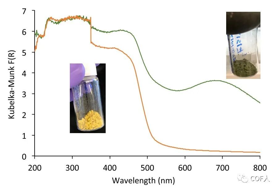 图5 DBA-COF 5(橙色)及其金属化后(绿色)的固体紫外吸收光谱