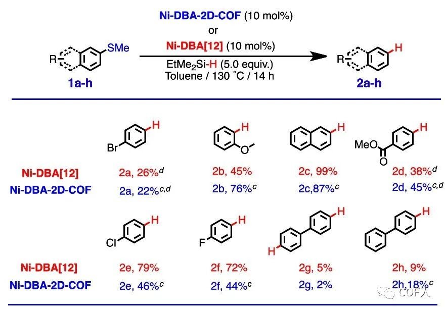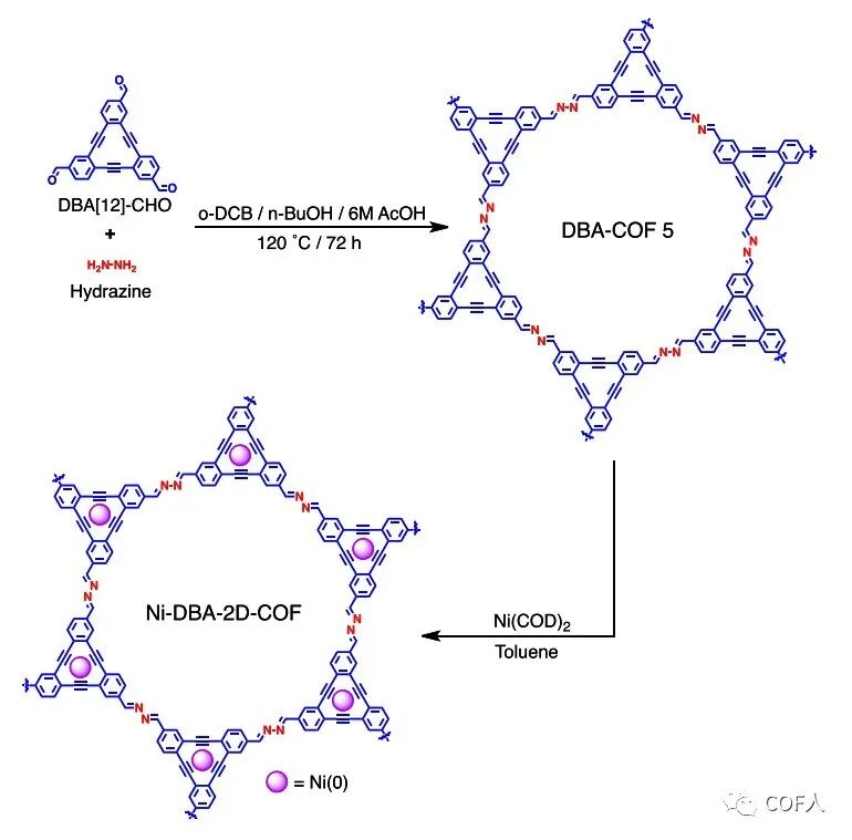 C-S键的还原裂解(即加氢脱硫(HDS))在石油除硫以生产清洁的化学燃料方面起着关键作用。前人已经报道可以使用双(1,5-环辛二烯)镍(0)(Ni(COD)2)配合物等材料催化还原裂解惰性芳基C-S键,然而此反应往往在均相条件下均进行,因此在催化剂稳定性,可回收性和催化剂分离等方面仍然是一个挑战!根据COF的特性,其经过目的性结构设计后有望作为一个很好的异相催化载体。这篇文章报道了一种含零价镍的脱氢轮烯(DBA)结构单元的2D-COF(DBA-COF 5)的合成、表征和其在C-S键还原裂解催化上的应用。