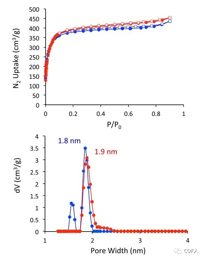 图2 DBA-COF5(红色)和Ni-DBA-2D-COF(蓝色)的N2吸附和孔径分布