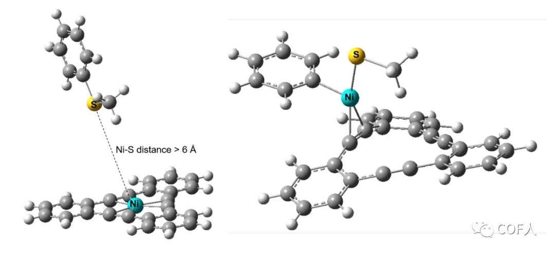 作者也对此材料的催化机理进行了解释,DFT结果发现芳基硫醚底物不与DBA-Ni(0)在中心结合,因为Ni中心与三个炔基已经配位饱和。所以要完成反应,Ni必须从DBA空腔中pop out,并仅与一个炔烃配位。之后与底物形成三配位络合物,然后才能氧化加成入C-S键(图8),之后经过还原消除恢复原始催化剂状态。