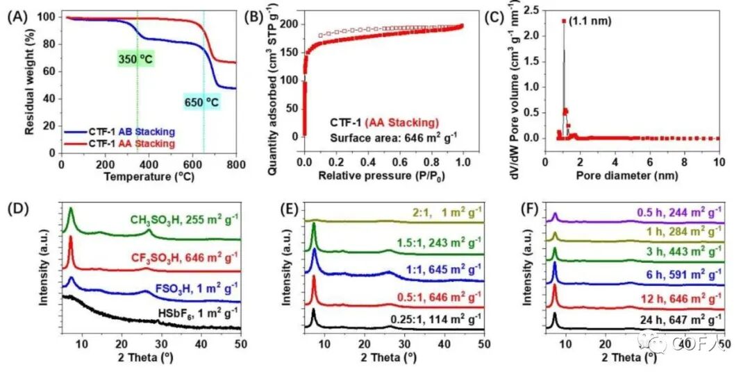 综上,此文报道了一种在温和的条件下,无需金属或有机溶剂的简便、新颖、高效的制备高结晶CTF材料的方法。该方法具体为在一定量的超强酸催化下,先以交错AB堆积方式形成了CTF-1-AB,然后在氮气气氛下热处理除去结构中酸催化剂,从而逐渐转变为AA堆积方式,最终得到结晶度、纯度和比表面积都很高的CTF-1-AA。此外,这一方法还可以推广到氟含量可控的氟化CTF的制备。