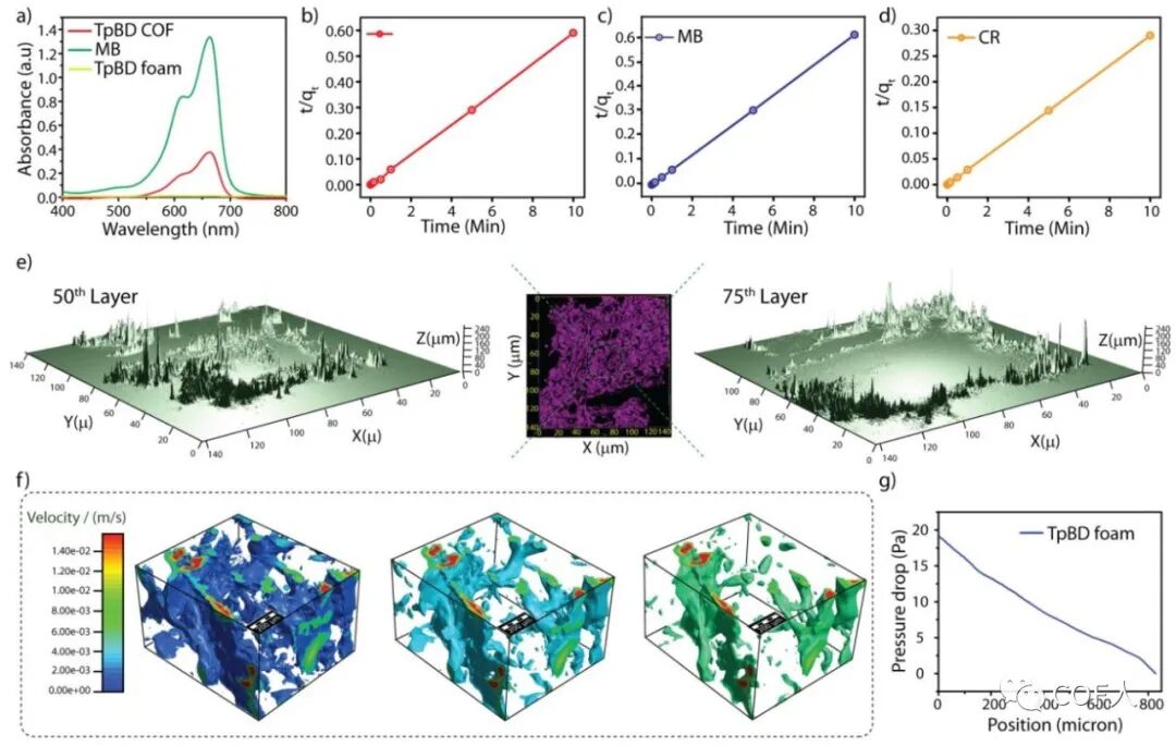 作者借助2.5D共聚焦显微镜分析(2.5D confocal microscopic analysis)研究染料分子在COF-GO海绵中的吸附行为,发现染料分子可以深入海绵内部多层。用三维X射线微断层成像(3D X-ray microtomography )技术进行水流分析研究,发现流速越大染料溶液可接触的大孔越多,这进一步表明在COF基质内部大孔对于污染物吸附的重要性。