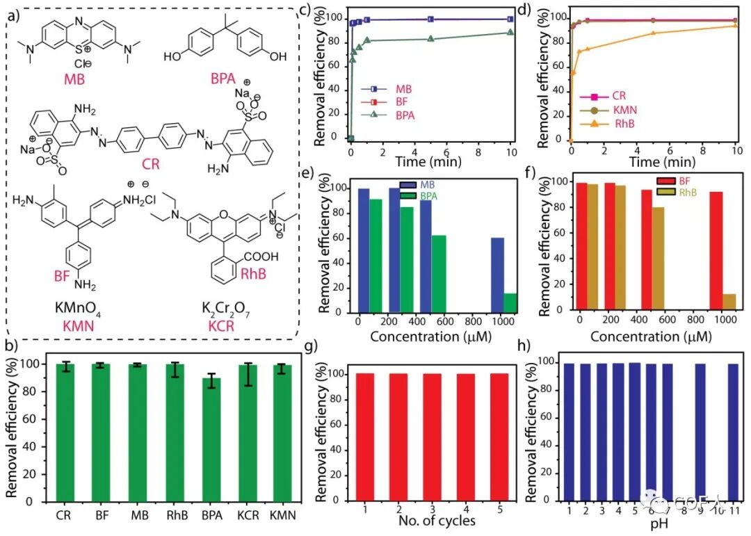 3D打印的COF-GO海绵由分级连接的各种尺度的孔结构组成,可以与吸附质分子发生非共价相互作用(即物理吸附)使其得到有效吸附与分离。三种不同的COF-GO海绵(TpBD、TpDq和TpAzo海绵)均被用于吸附水中的染料污染物亚甲基蓝(MB)、刚果红(CR)、罗丹明B(RhB)、碱性Fuschin(BF)、双酚A(BPA)、KMnO4(KMN)和K2Cr2O7(KCR)(图4)。其中TpBD海绵具有最高的效率、普适性与稳定性。并且吸附后可以容易的通过有机溶剂浸泡洗涤的方法使COF海绵进行再生,并且具有非常好的循环性(图4g)。