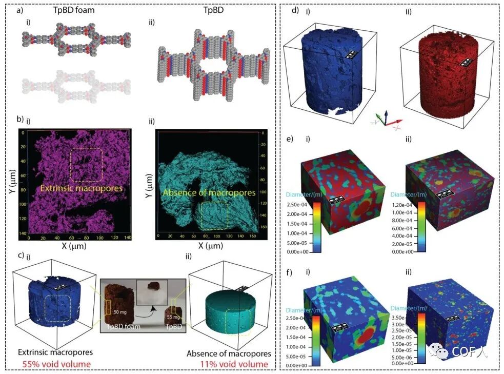 之后对COF-GO海绵的进行了共聚焦荧光显微镜3D成像(图3左)和微尺度3D X射线断层扫描(图3右),以直观的证实所合成材料的多孔特征。