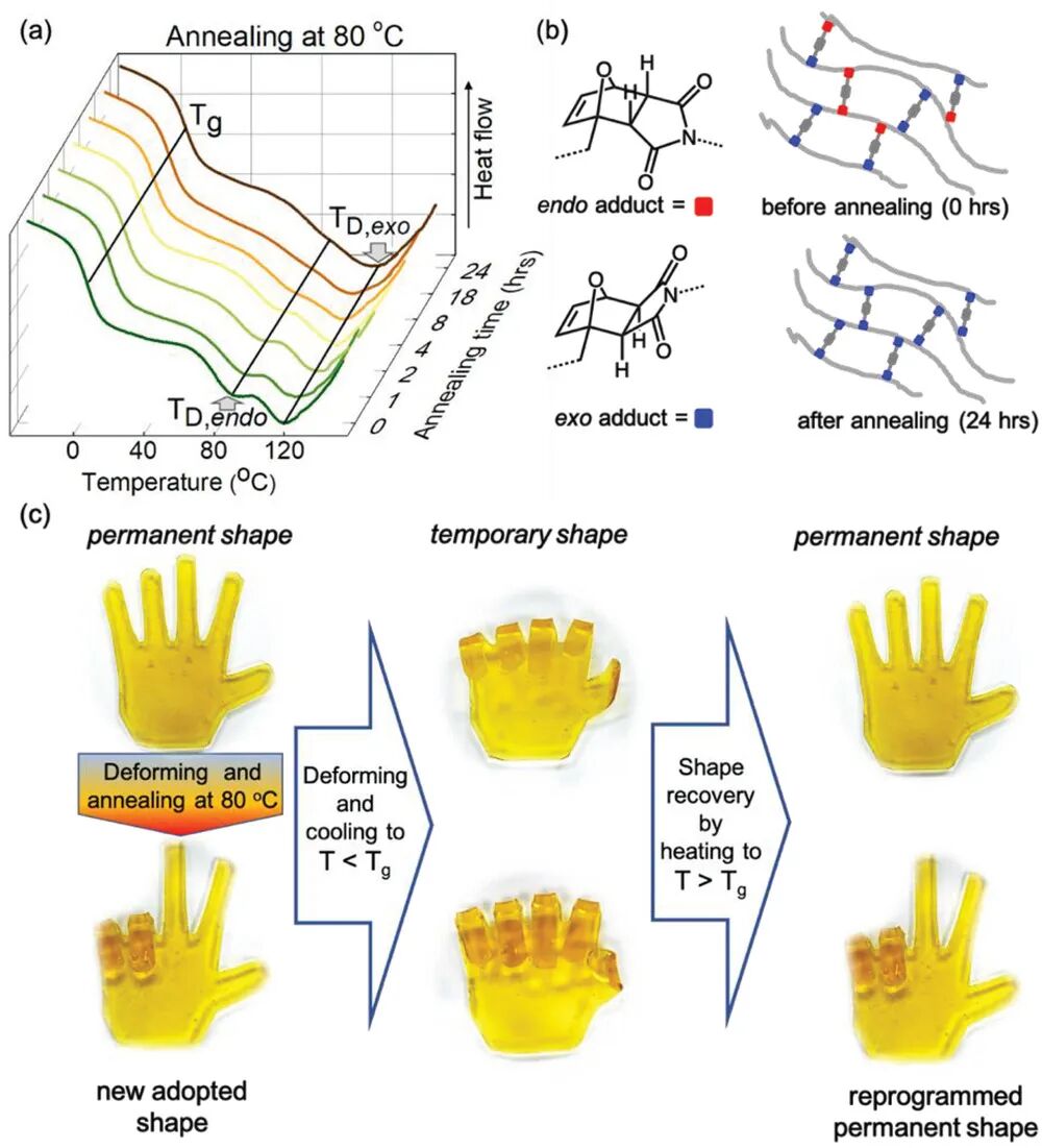 1)这些材料基于动态共价聚合物网络,该网络具有通过温度可逆的Diels-Alder(DA)反应与预聚物主链连接的可变密度的交联剂。预聚物链的固有柔韧性和可控制的交联密度使3D打印网络的玻璃化转变温度范围从几摄氏度到几十摄氏度。