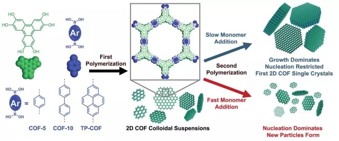 研究人员以预先聚合生成的纳米颗粒作为晶种,然后缓慢加入单体,最终得到微米尺度的多种二维单晶COFs。对于所有的晶种法而言,都存在一个如何平衡成核与生长的问题,作为有机单晶的COFs也不例外。如果在第二步生长阶段单体加入速度过快,超过成核临界浓度,将产生新的晶核,导致最终晶粒尺寸变小且不均匀。