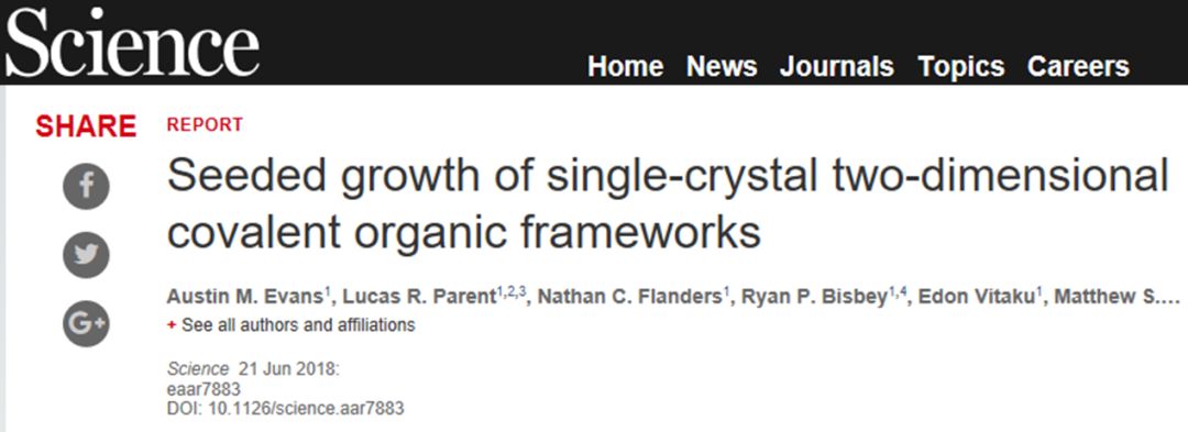 Austin M. Evans, William R. Dichtel et al. Seeded growth of single-crystal two-dimensional covalent organic frameworks. Science 2018.