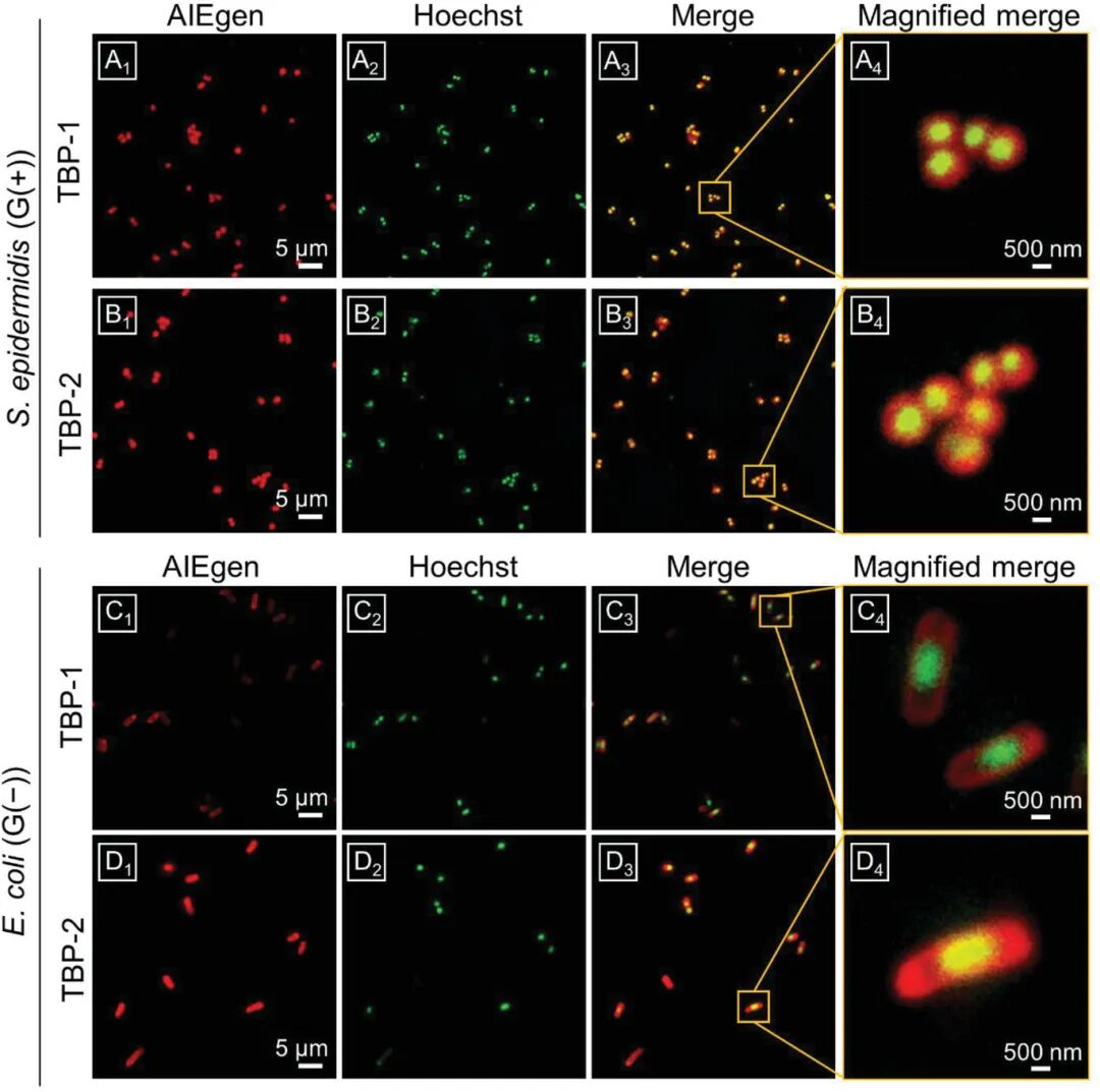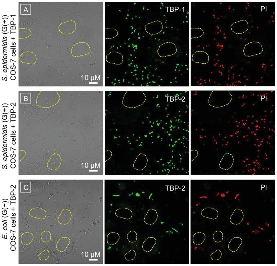 2)在光灭活实验中使用的条件下,AIE PSs可以选择性地成像并杀灭哺乳动物细胞上的细菌。因此,在需要保留有益的G(−)菌的生物医学应用中,TBP-1有望成为一种有效的G(+)抗菌剂。TBP-2具有作为G(+)和G(−)抗菌剂的潜力。研究工作表明,PSs上的正电荷数量对抗菌效果起着重要的作用这项工作为新型抗菌材料的合理设计提供了新的思路,并将促进AIE PSs在生物医学应用中的发展。