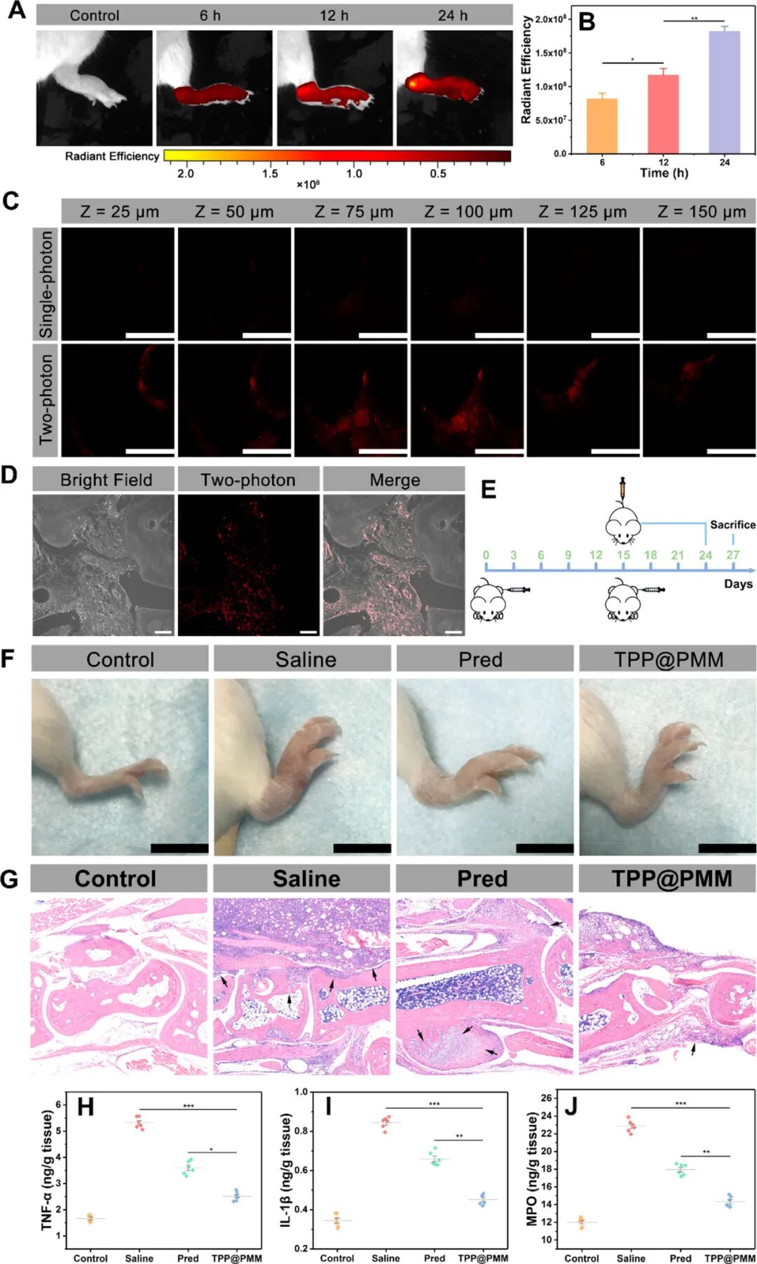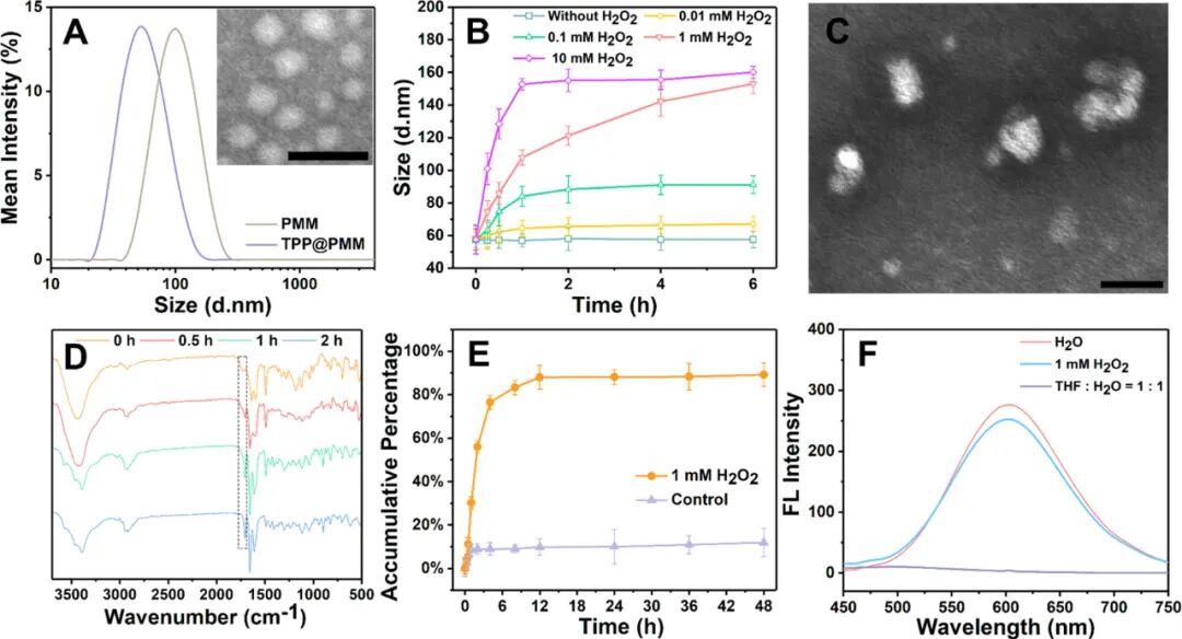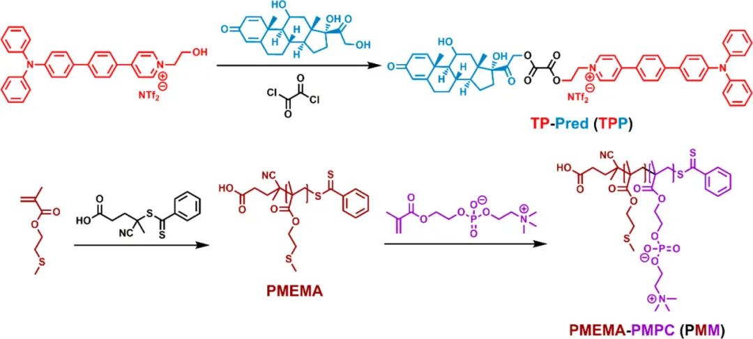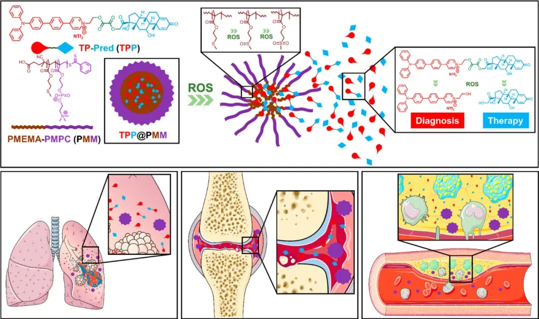 泼尼松龙(Prednisolone, Pred)通过ROS敏感键连接到开发的双光子荧光团(TP),形成诊断治疗化合物TPP,然后由两亲性聚合物PMPC-PMEMA(PMM)自组装成核壳结构胶束(TPP@PMM)。TPP@PMM的粒径为57.5 nm,可以通过水肿组织实现炎症部位的蓄积,并通过对局部过表达的ROS的系列反应来准确释放抗炎药物Pred。