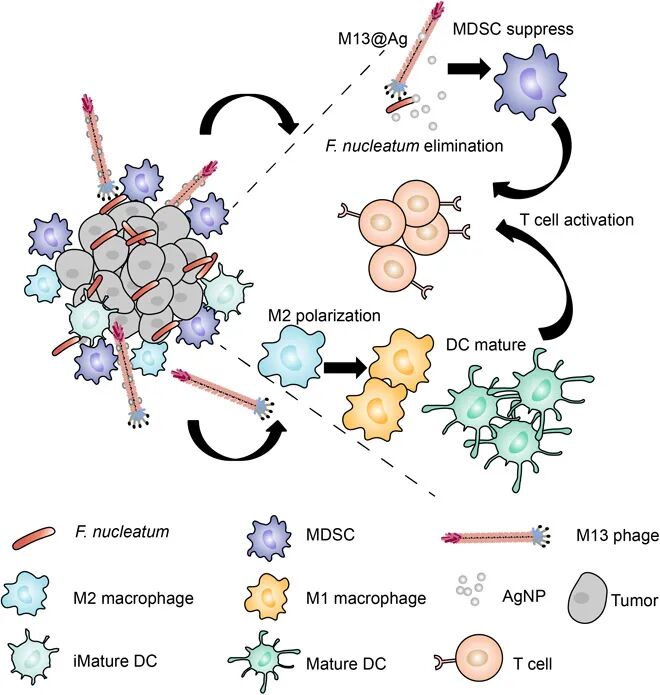 越来越多的证据表明,肠道菌群有助于结直肠癌(CRC)的肿瘤发生,其中共生核酸核梭菌(Fn)选择性地增加了免疫抑制的髓样来源的抑制细胞(MDSC),以阻碍宿主的抗癌免疫反应。于此,武汉大学张先正教授等人通过噬菌体展示技术筛选了一株特异性Fn结合的M13噬菌体。然后,将银纳米颗粒(AgNP)静电组装在其表面衣壳蛋白(M13@Ag)上,以实现Fn的特异性清除并重塑免疫肿瘤的微环境。