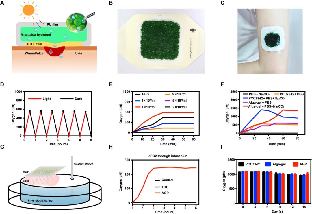 设计了称为藻胶贴片(AGP)的贴片,可以简单地覆盖伤口并将溶解的氧气输送到伤口床中。在贴片中填充了直径为1毫米的含有活微藻的水凝胶珠,可以吸收预先添加的碳酸盐(CO2-3和HCO-3),以通过呼吸和光合作用产生O2和CO2。孔径为0.22 μm的亲水性聚四氟乙烯(PTFE)膜用作AGP的衬里,以允许清洁气体和水双向渗透并具有细菌过滤性能。当贴在伤口上时,由于不可渗透的聚氨酯薄膜被用作AGP的背衬,在敷料和伤口之间形成了一个密封系统。假设伤口的二氧化碳,氧气和湿气可以通过AGP充分升高和调节,以全时,有氧和湿法修复组织。