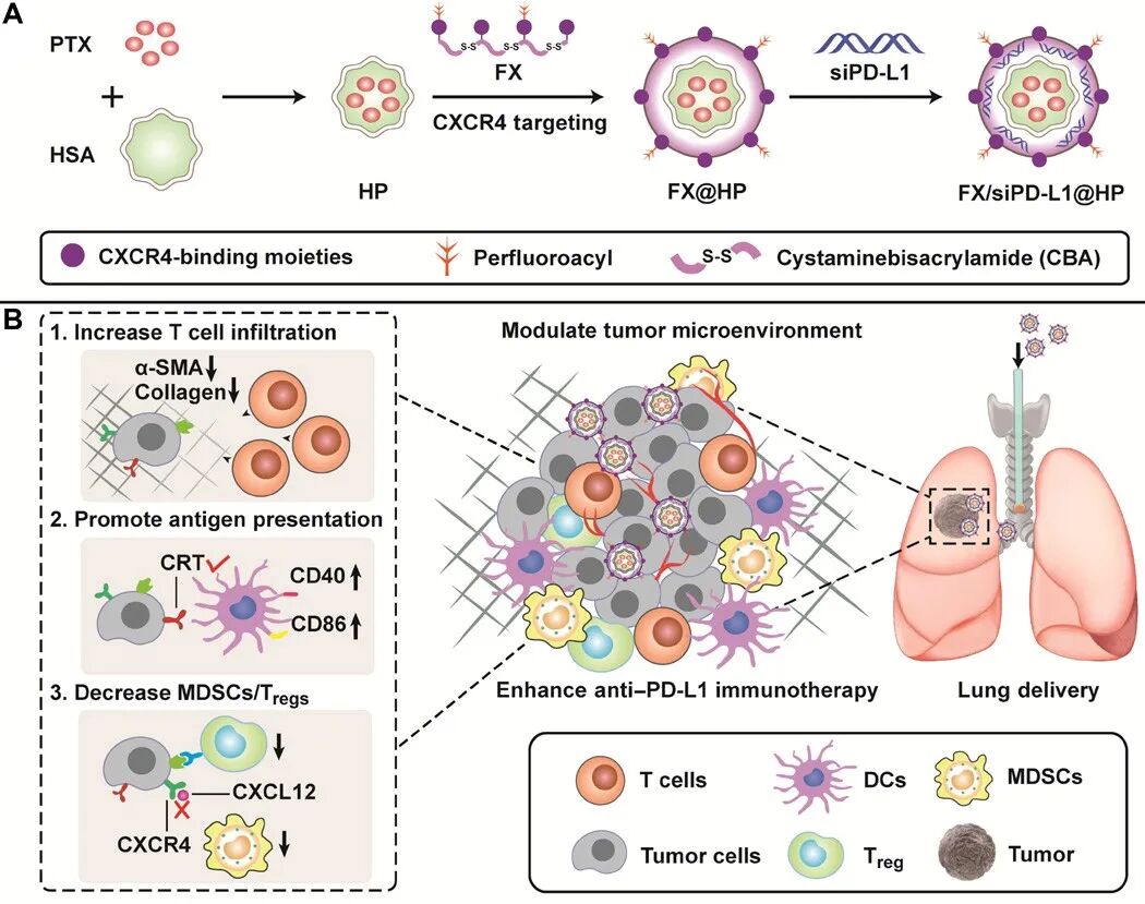 抗程序性细胞死亡1配体1(PD-L1)治疗在选定的癌症患者中非常有效。然而,淋巴细胞浸润不足,弱T细胞诱导的炎症,以及肿瘤微环境(TME)中免疫抑制细胞的聚集可能会大大降低疗效。有鉴于此,中国药科大学的孙敏捷、美国内布拉斯加大学医学中心的David Oupicky等研究人员,报道了由氟化聚合的CXCR4拮抗剂(FX)和载紫杉醇的人血清白蛋白(HP)组成的FX@HP纳米复合物的研制,用于肺递送抗PD-L1小干扰RNA(siPD-L1)治疗原位肺肿瘤。