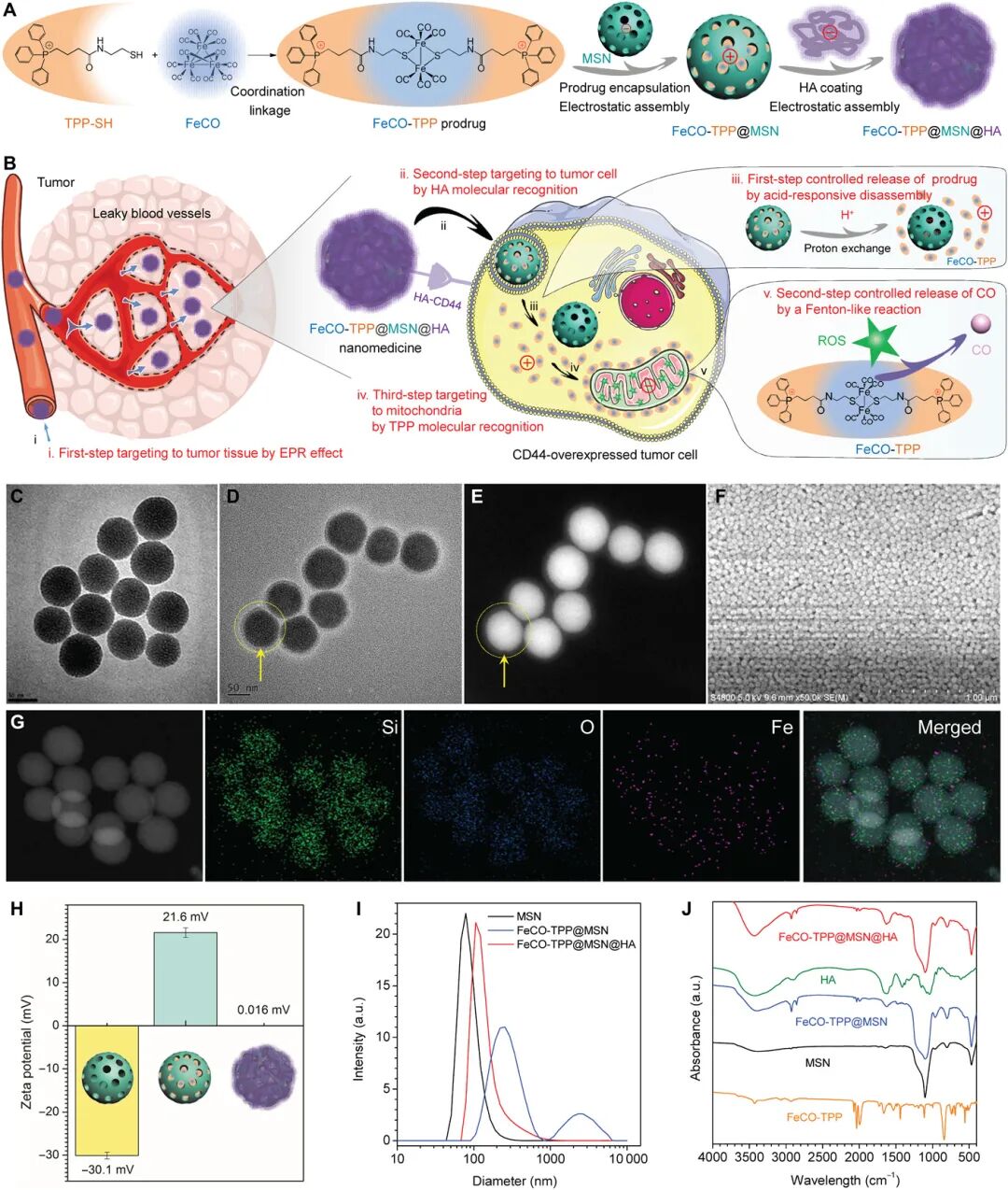 CO气体分子不仅可以选择性地杀死癌细胞,而且由于缺乏活性肿瘤靶向积累能力而表现出有限的抗癌功效。在这项工作中,深圳大学何前军等人开发了一种多级组装/拆卸策略,通过将线粒体靶向和线粒体内微环境响应前药(FeCO-TPP)封装在介孔二氧化硅纳米粒子中来构建新型智能纳米药物,该纳米粒子通过逐步静电进一步涂有透明质酸组装,以逐步拆卸的方式实现肿瘤组织-细胞-线粒体靶向的多级递送和CO的控制释放。