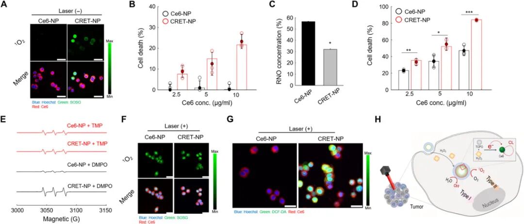 化学发光(CL)在CL共振能量转移(CRET)介导的肿瘤光动力治疗中得到了广泛的关注。然而,由于CL信号持续时间短,光敏剂的量子产率低,限制了它的应用。于此,韩国成均馆大学Jae Hyung Park等人通过重新解释CRET的隐藏性质,报道了基于CRET的纳米颗粒(CRET NPs)来实现量子产率增强的癌症光疗。