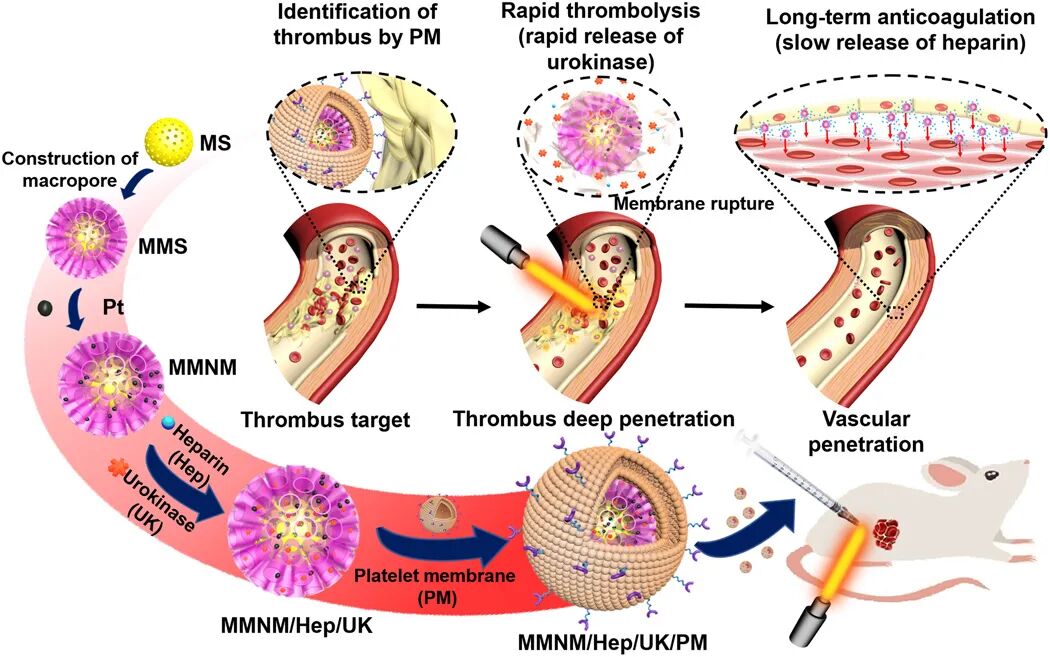 静脉血栓形成,包括深静脉血栓形成和肺栓塞,在世界范围内发病率很高,每年的发病率约为每密耳1-3例,这可能危及生命。目前,静脉血栓形成的治疗主要包括两个阶段。在早期阶段,使用溶栓药来重新血管化,在后期阶段,使用抗凝药来防止血栓形成的再生。静脉血栓形成的治疗困难包括药物的半衰期短,利用率低以及在血栓部位的渗透性差。于此,南京鼓楼医院史冬泉、南京师范大学毛春、Mimi Wan等人开发了一种具有血小板膜(PM)修饰的介孔/大孔二氧化硅/铂纳米马达(MMNM/PM),用于依次靶向血栓溶解和抗凝药物的治疗。