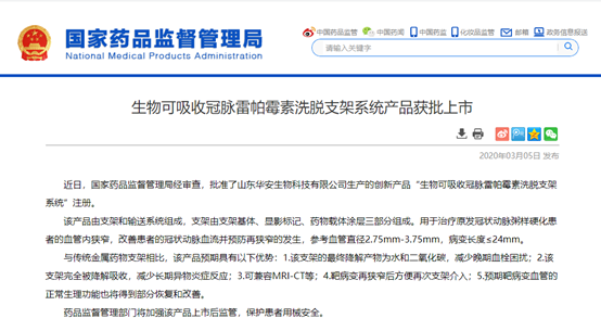 据国家药监局官网和复旦大学中山医院消息,由中国科学院院士葛均波教授领衔团队与山东华安生物技术有限公司合作,历经十余年研发、科研攻关及临床研究随访,研制出具有我国自主知识产权的生物可吸收冠脉雷帕霉素洗脱支架——XINSORB支架,于3月5日通过国家药品监督管理局审批上市。这也是我国最早开始自主研发的生物可吸收支架。