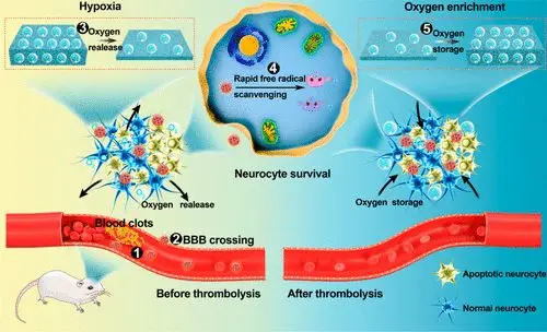 由于红细胞的隐形作用以及在T7肽的辅助下在梗塞部位的优先蓄积,血液循环时间长MNET在缺血性中风的两个阶段发挥了独特的治疗作用:(i)溶栓前,通过快速清除自由基和及时供氧来挽救神经细胞;(ii)溶栓后,通过储氧抑制氧增加,清除自由基,避免再灌注损伤。MNET通过对病理微环境的阶段性调节,在缺血性脑卒中治疗中具有诱人的应用前景。