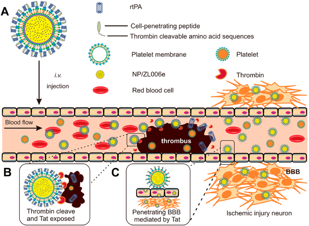 由血栓阻塞和缺血引起的缺血性中风是一种容易致残甚至致命的脑血管疾病之一。而开发一个可以将溶栓剂和神经保护剂分别送到血栓和缺血半暗带位置的顺序靶向给药系统则有望实现很好的联合效果。受血小板在血栓形成中的重要作用的启发,加州大学顾臻教授和南京医科大学辛洪亮等人开发了一种生物工程纳米血小板(tP-NP-rtPA/ZL006e),用于对重组组织纤溶酶原激活剂(rtPA)和神经保护剂(ZL006e)进行顺序特异性递送。