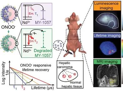 第二近红外(NIR-II)窗口的深层组织成像为广泛的基础研究提供了广阔的前景。然而,由于组织吸收和散射导致的不均匀信号衰减,阻碍了其在体内精确生物传感中的应用。在此,复旦大学Fan Zhang等人提出了一种利用肿瘤微环境(过氧亚硝酸盐,ONOO−)响应型镧系-花菁Förster共振能量转移(FRET)纳米传感器在近红外区域进行基于寿命的原位肝细胞癌(HCC)检测方法。