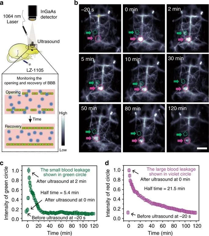 1)由于较长的血液循环时间(半衰期为3.2 h),该荧光团可用于实时实时监测动态血管过程,包括后肢的缺血性再灌注,颈动脉的溶栓以及血脑屏障的开放和恢复(BBB)。