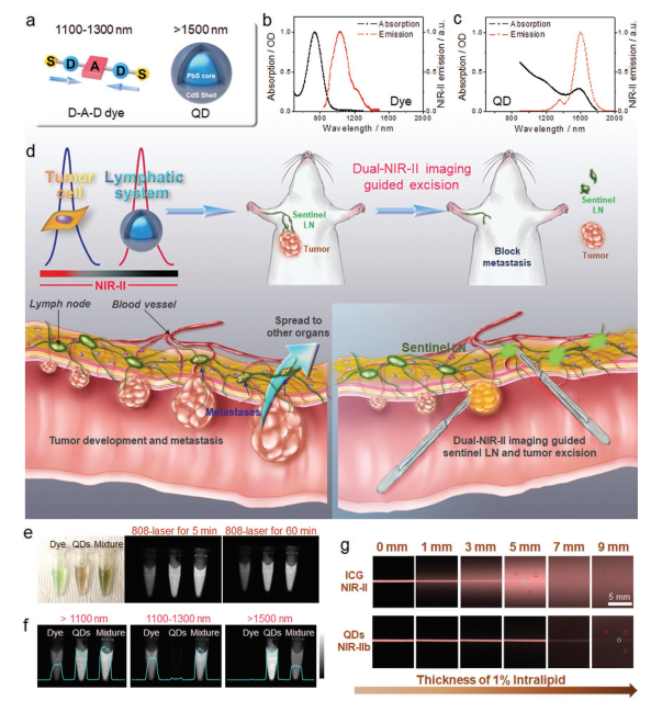 2)具有致密聚合物涂层的超亮PbS/CdS核/壳量子点(QD)用于在NIR-IIb(>1500nm)窗口中可视化癌症侵入的前哨LN。与临床使用的吲哚菁绿相比,QD显示出优异的亮度和光稳定性(即使在连续激光照射5小时后也没有明显的漂白);因此,前哨LN检测仅需要皮摩尔剂量。这种双NIR-II图像引导手术的组合可以在明亮的光线下进行,增加了其在临床使用中的便利性和吸引力。