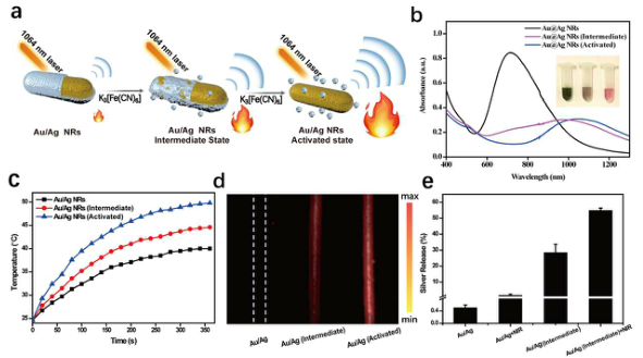 1)铁氰化物溶液能有效地活化Au/Ag NRs,并允许其持续释放游离Ag+以消除MRSA,触发NIR-II光热和PA性能的增强。
