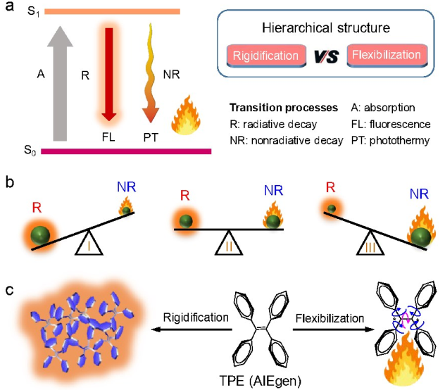 (1)聚集诱导发光(AIE)是一种前沿的荧光技术,可以产生高效率的光致发光。在近红外II区 (NIR-II, 1000-1700 nm)范围内发光的AIE发光分子则在生物医学成像和治疗方面表现出了显著的优势。然而在这些窄带隙的材料中,如何通过分子设计以调节其荧光(辐射途径)和光热 (非辐射途径)的平衡以及其中潜在的机制目前仍不清楚。