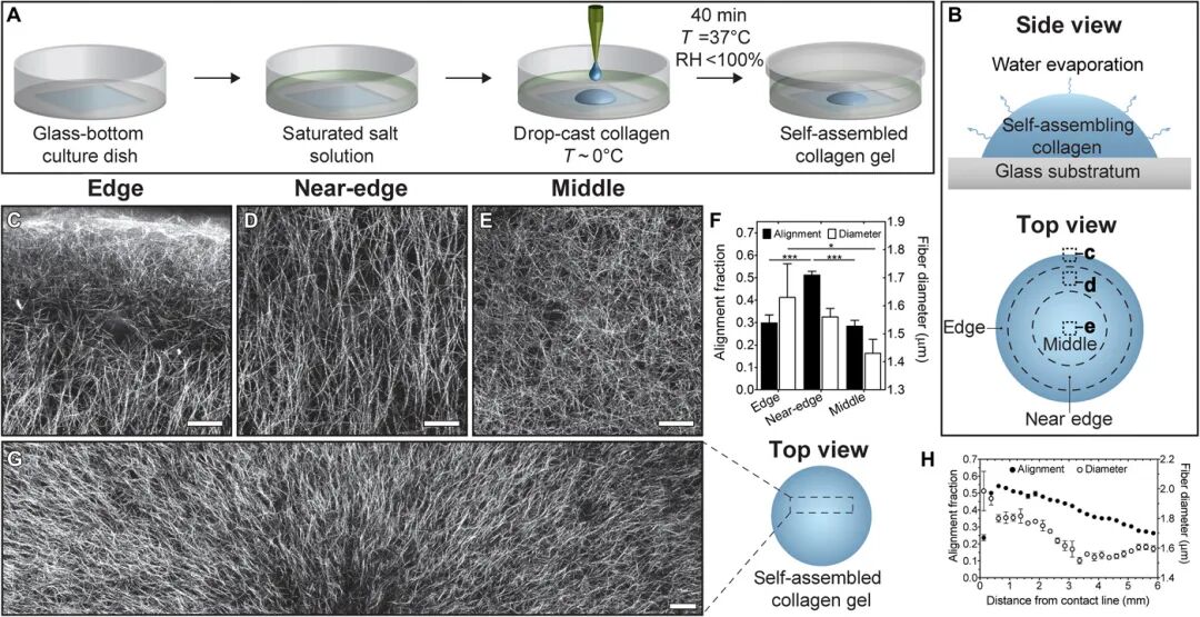 1)研究人员发现Marangoni流(一种物理现象,即由于表面张力在液体界面起作用,引起一个表面张力梯度,表面张力梯度超过粘滞力,使液体流动,出现毛细管对流)以一种依赖于自组装速率、周围环境的相对湿度和液滴几何结构的方式,将胶原纤维组装直接在毫米级区域上进行。