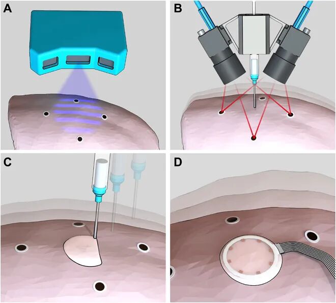 在活体人体器官上直接打印兼容生物医学设备的能力,有利于病人的监护和伤口治疗,这就要求3D打印机能够适应生物表面的各种变形。美国明尼苏达大学Michael C. McAlpine等人开发了一种原位3D打印系统,可以实时估计目标曲面的运动和变形,以适应刀具路径。