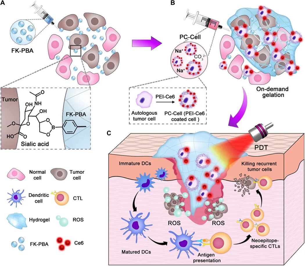 自体基于肿瘤细胞的疫苗(ATV)正在作为一种可转化的方法用于个性化免疫治疗,但其治疗效果仍不能使癌症患者满意。于此,上海药物研究所李亚平、王当歌等人设计了一种在Fmoc-KCRGDK-苯硼酸(FK-PBA)水凝胶中进行光动力疗法(PDT)激发的ATV(P-ATV),该水凝胶可动员局部免疫激活来抑制术后肿瘤的复发。