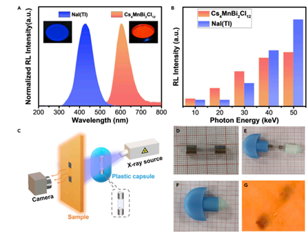 2)最后,作者基于Cs4MnBi2Cl12钙钛矿单晶中Bi3+大的原子质量及原子序数,有助于X射线吸收,并结合Cs4MnBi2Cl12其强的发光性能,重点探讨了其X射线发光性能,并与商业化的NaI(Tl)闪烁体进行比对,发现 Cs4MnBi2Cl12具有强的软X射线吸收(10–35keV),并进一步研究了其X射线成像的应用,展现出良好的应用潜力。