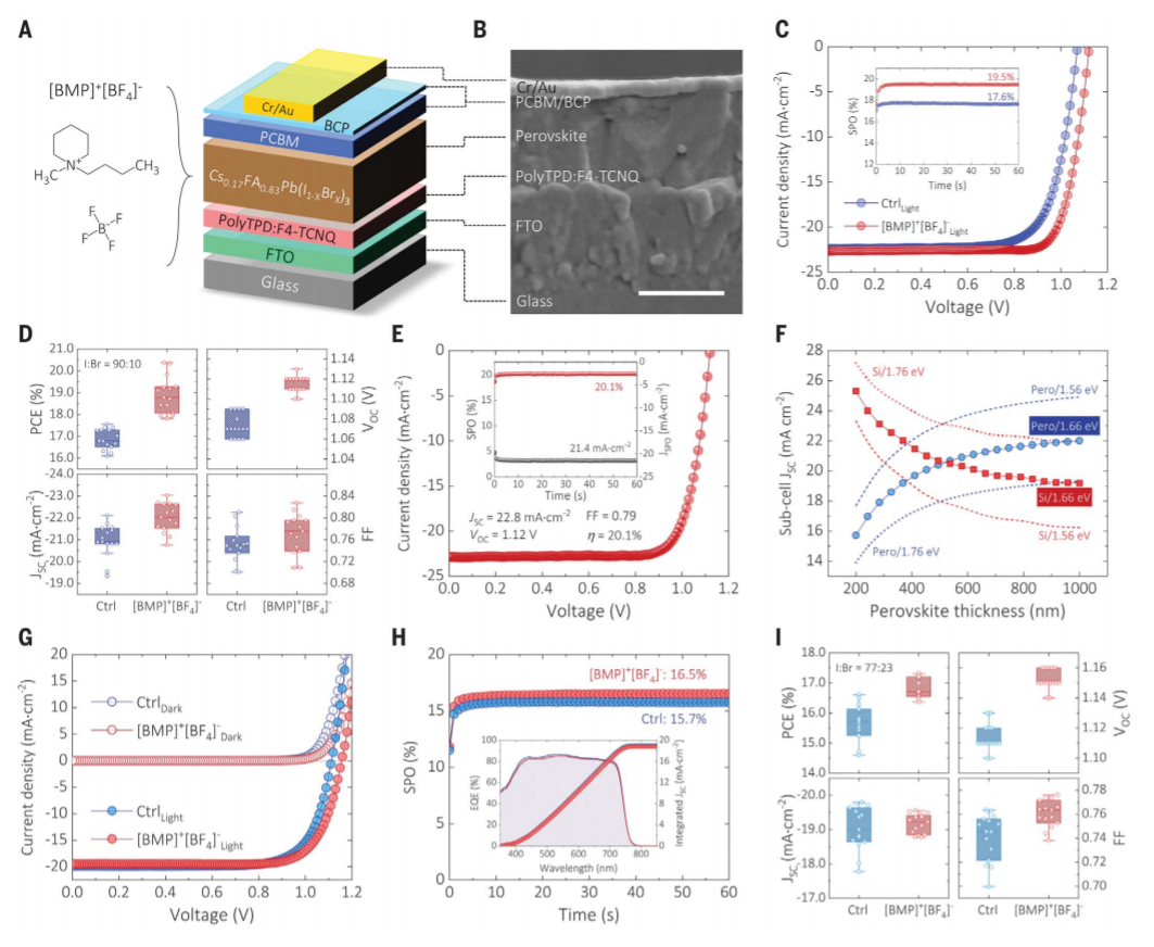 Henry J. Snaith等人通过将哌啶基烷基阳离子-硼氟酸阴离子组成的离子化合物([BMP]+[BF4]-)引入钙钛矿材料中。通过对能带结构进行调控,将其用于钙钛矿/硅叠层太阳能电池的构建。在超过1000 h的长时间工作后,电池的开路电压能保持在1.2 V。通过在空气中进行测试,结果显示未封装电池和封装后的电池分别在60 ℃和85 ℃中进行1010 h和1200 h连续测试,保持了80%和95%的性能。