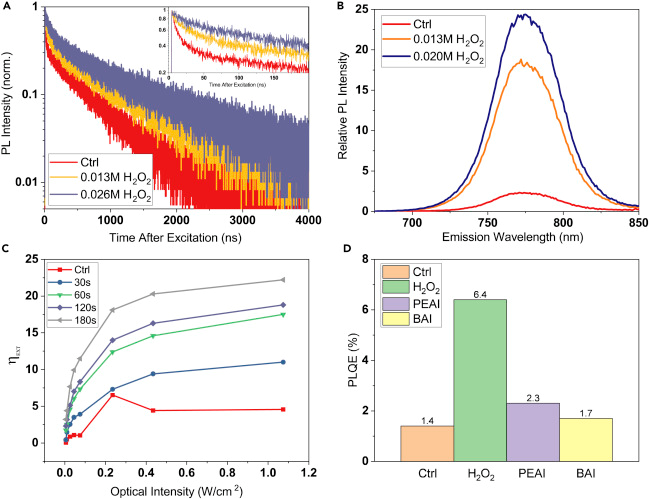 牛津大学Henry J.Snaith和BernardWenger团队提出了一种综合机制,用于钝化金属卤化物钙钛矿。研究表明,过氧化氢形成铅-氧键是减少钙钛矿缺陷的关键因素。过氧化氢可以直接用作有效的“后处理”以模拟该过程,并显著提高光致发光的量子效率。进一步将该处理方法用于入光伏器件中,以使开路电压增加50 mV,混合阳离子FA0.83Cs0.17Pb(I0.83Br0.17)3钙钛矿太阳能电池具有高达19.2%的稳态效率。