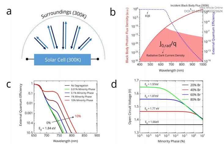 鉴于此,牛津大学Henry J.Snaith和PabitraK.Nayak团队将傅里叶变换光电流能谱(FTPS)与详细的平衡计算相结合,以量化卤化物分离所预期的电压损失,从而提供一种方法来量化卤化物分离过程中低带隙富碘化物相的形成所导致VOC损失。 研究结果表明,与普遍的看法相反,卤化物的分离不是富含Br的宽带隙电池中主要的VOC损失机制。而是,损耗主要由电池的相对较低的初始辐射效率决定,这是由吸收层内以及钙钛矿/电荷提取层异质结处的缺陷引起的。即使不能抑制卤化物的分离,1.73 eV带隙钙钛矿的VVOC仍可达到1.33 V。因此,研究人员认为,应该重点放在提高混合卤化物薄膜和器件的初始辐射效率上比尝试抑制卤化物的分离更为重要。