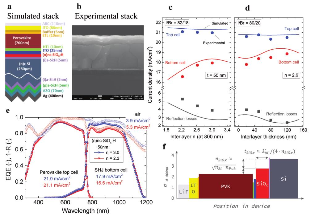 钙钛矿/硅串联太阳能电池具有潜力,可以将电池效率提高到超过晶体硅(Si)单结极限。但是,与透明导电氧化物和钙钛矿吸收层相比,Si的相对较大的光学折射率会导致单片(两端)器件中电池内部连接处的明显反射损失。因此,光管理对于提高硅底部电池的光电流吸收至关重要。