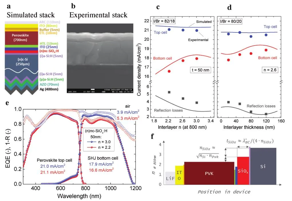 Henry J. Snaith团队通过使用由纳米晶氧化硅组成的光学中间层,可以显着减少在平坦硅衬底上处理的串联电池中的红外反射损失。结果表明,110 nm厚的中间层(折射率为2.6(800nm))在硅底部电池中产生1.4 mA cm-2的电流增益。在AM1.5G辐照下,活性面积1.1 cm2的钙钛矿/硅单片串联电池表现出顶部电池+底部电池的总电流密度为38.7 mA cm-2,并且认证的稳定功率转换效率高达25.2%。
