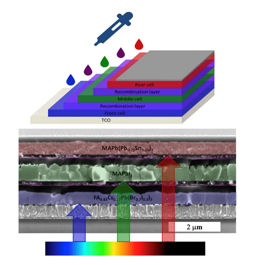 Henry J. Snaith团队通过使用高挥发性乙腈(CH3CN)/甲胺(CH3NH2)(ACN / MA)溶剂型钙钛矿溶液,展示了完全溶液法的吸光层,传输层和复合层,用于整体式全钙钛矿三结太阳能电池。通过结合FA0.83Cs0.17Pb(Br0.7I0.3)3(1.94 eV)和MAPbI3(1.57 eV)结,达到超过15%的两端串联效率(稳态)。首次研究表明,MAPb0.75Sn0.25I3(1.34 eV)窄带隙钙钛矿可以通过ACN / MA溶剂型系统进行处理,单片全钙钛矿三结太阳能电池开路电压达到2.83 V。通过光学和电子建模,估计最先进的三结器件架构的可实现效率为26.7%。该工作为大规模,低成本,可印刷的钙钛矿多结太阳能电池开辟了新的可能性。