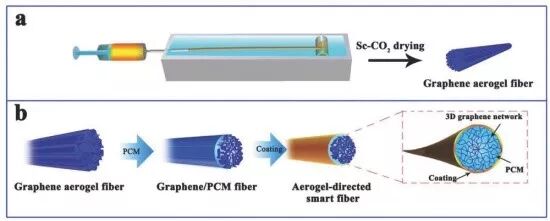 然而,块体石墨烯气凝胶相变复合材料在三维方向上具有的刚性-均匀性,使其难以应用于柔性可穿戴系统之中。将石墨烯气凝胶纤维化,随后在纤维结构中引入相变材料,不仅最大化利用各种材料的理化性能,还可极大简化了智能纤维的设计与制备工艺,在新型柔性智能可穿戴器件的发展中占有重要地位。