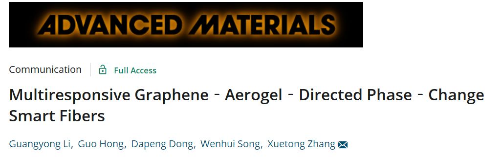 Guangyong Li, GuoHong, Dapeng Dong, Wenhui Song, Xuetong Zhang*, Multiresponsive Graphene-Aerogel-DirectedPhase-Change Smart Fibers, Advanced Materials, 2018, DOI:10.1002/adma.201801754.