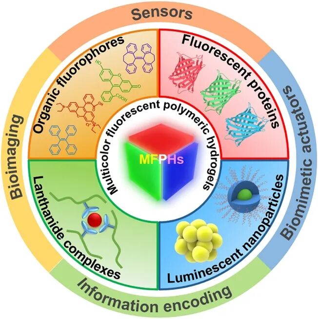 多色荧光聚合物水凝胶(MFPH)是具有可调发射色的三维交联亲水聚合物网络。与主要用于干燥固态或溶液的经典荧光材料不同,MFPHs以高度水溶胀的准固体形式存在。因此,它们呈现出固体和溶液的许多有前途的特性,包括类似组织的机械性能、固有的柔软和湿润性质、出色的生物相容性以及响应的体积、形状和荧光色变化。这些有利的特性在许多应用中具有巨大潜力,例如传感,生物成像,信息编码,加密,仿生致动器和软机器人。