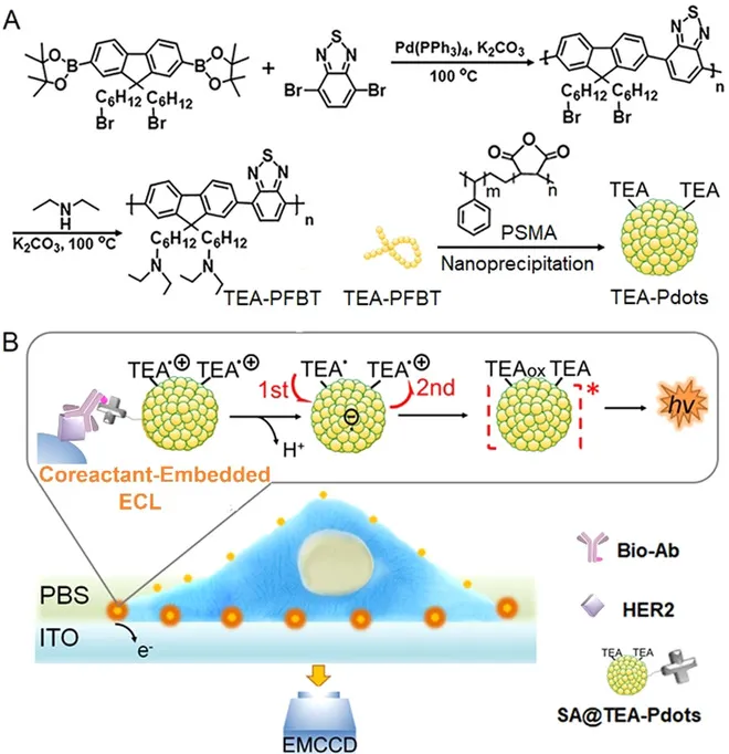 电化学发光(ECL)中将共反应剂转运至发射体的需求以及自由基寿命短的需求,极大地抑制了其在细胞传感和显微成像中的应用。于此,南京大学鞠熀先等人设计了一种双分子内电子转移策略和叔胺共轭聚合物点(TEA-Pdots),以开发嵌入共反应剂的ECL机理和微成像系统。