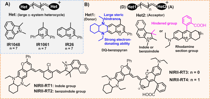 基于有机染料的NIR-II荧光探针由于具有高的信噪比和更深的穿透性,非常适用于对体内的深部组织进行高对比度的成像。然而,由于缺乏合适的染料,如何设计可被激活的NIR-II荧光探针仍然是一个很大的研究挑战。湖南大学张晓兵教授设计了一类新颖的多甲基染料(NIRII-RTs),其具有明亮(量子产率高达2.03%)、稳定和抗溶剂猝灭的NIR-II发光性能以及大的Stokes位移等优势。