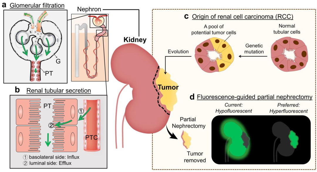 肾小管分泌是肾脏清除分子的一种主动外排途径,但它从未被用于增强对肾癌的靶向性。德克萨斯大学达拉斯分校郑杰教授将吲哚菁绿(ICG)与2100 Da的 PEG分子相结合,构建了首个可被肾小管分泌的近红外发光荧光团(ICG- peg45),并将其用于对肾癌进行高性能的荧光成像。