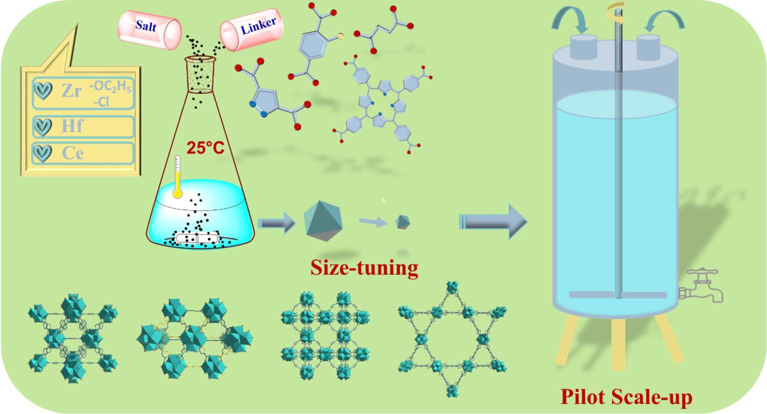 2. Angew: 室温合成Zr,Hf,Ce基MOF在室温中通过绿色方法合成MOF材料,受到广泛关注。该方法制备的MOF能构建多种官能团,但是仅有少数例子能够在温和条件中合成由IV价金属构成的MOF,而且合成方法有产率较低、合成步骤复杂等缺点,导致其无法用于各种应用中。有鉴于此,巴黎文理研究大学Antoine Tissot、Christian Serre等报道一种一步简单方法在室温中合成一系列多孔结构M6(IV)氧簇MOF材料(M=Zr,Hf,Ce),通过不同有机配体修饰,能分别构建8元/12元多孔结构。1)通过一步法合成多孔Zr/Hf/Ce羧酸基MOF,而且通过调控合成过程参数能够控制产物粒径大小。尝试了5 L放大合成系统,展示了大规模合成可行性。2)得到的产物中有不同程度的缺陷,同时保持MOF结构的稳定性。通过原位动力学方法对MOF材料生长过程进行分析,结果显示该合成方法能够在室温中非常高效,同时产物粒径可调控,为其实际应用提供了机会。Shan Dai, Farid Nouar, Sanjun Zhang, Antoine Tissot*, Christian Serre*, One‐step versatile room temperature synthesis of metal(IV) carboxylate MOFs, Angew. Chem. Int. Ed. 2020DOI: 10.1002/anie.202014184https://www.onlinelibrary.wiley.com/doi/abs/10.1002/anie.202014184