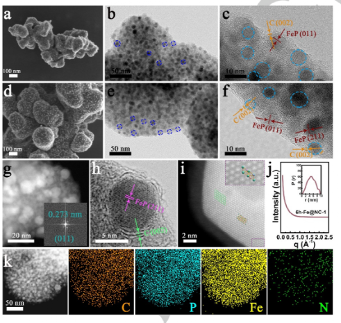 具有较高的Na+储存性能和循环稳定性的电极材料对于提高钠离子电池的能量密度和倍率性能至关重要。基于此,中科院大连化物所李先锋研究员,郑琼副研究员,燕山大学唐永福教授报道了提出了一种珊瑚状的FeP复合材料,即将FeP纳米颗粒锚定和分散在氮(N)掺杂的三维(3D)碳骨架上(FEP@NC)。FeP纳米颗粒均匀分布在纳米氮化碳基体上,通过催化周围的非晶碳生成层状石墨化碳,对复合材料的石墨化程度起着至关重要的作用。