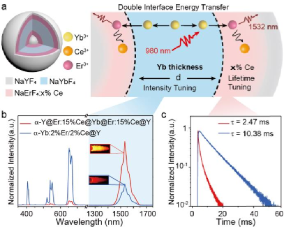 荧光寿命成像为在近红外II区(NIR-II)窗口实现体内多路复用提供了更多的可能性。然而,由于寿命可区分的荧光探针往往会表现出不同的荧光强度,特别是寿命较短的荧光强度较弱,此时背景噪声的干扰会使得对多路复用寿命信息进行同时译码变得困难。为了实现高保真寿命多路成像,复旦大学张凡教授开发了一系列Er3+掺杂的双界面荧光纳米探针(Er-DINPs): α-NaYF4@NaErF4: Ce@NaYbF4@NaErF4: Ce@NaYF4,