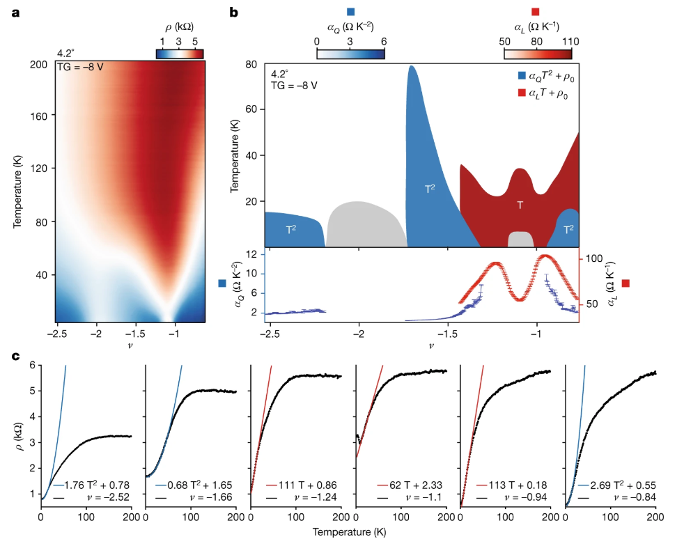 在该工作中,作者首先利用载流子浓度和电位移场调控,发现关联绝缘态有良好定义的边界,测量热激活能隙表明这里的带隙可以连续平滑变化到零,表明在边界处发生的是二级相变。随后研究了关联绝缘态附近掺杂调控的金属态,发现了电阻随温度变化反常的线性行为,然后作者研究了更大掺杂范围内电阻随温度变化的相图(图2),分析了电阻和温度的关系,发现这样的量子临界行为只存在于靠近关联绝缘态两边区域,并且在高温下不同于铜氧化物超导体的反常饱和现象,而在低温下其耗散与普朗克极限相当。