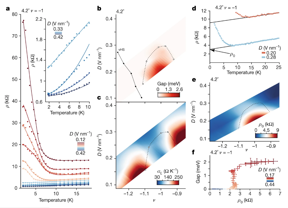 a.在金属-绝缘态相变范围内,对应的不同电位移场下的半填充态处的电阻与温度的关系;b.绝缘态带隙与载流子浓度以及电位移场的关系。c. 与b图中相同的掺杂范围内,线性系数αL随电位移场和填充系数变化关系。d.不同电位移场下,电阻与温度的关系。e.剩余电阻随掺杂浓度以及电位移场的变化。f.在半填充处,能隙与剩余电阻的关系。