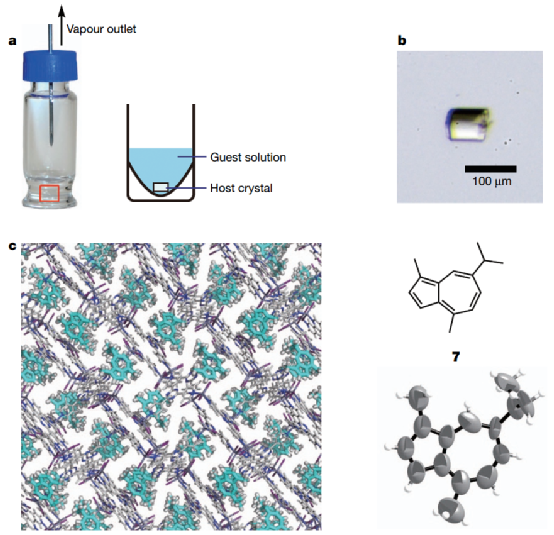 为了解决这个难题,东京大学Makoto Fujita等人发展了一种不需要样品结晶的X射线测试方法。这种方法非常简单:他们生长出一种大尺寸的空腔基质晶体,这些晶体可以吸附样品溶液中的小分子。如果小分子的大小和形状合适,就可以被宿主晶体的空腔捕获,然后以有序的方式排列,从而可以使用X射线晶体学对其进行研究。
