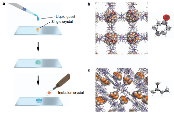 图1. 使用结晶海绵对液体客体分子进行X射线晶体学观察的示意图